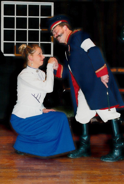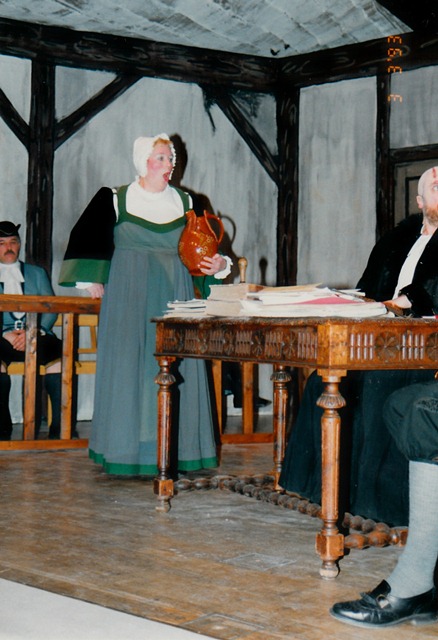 Inhaber Werner Payer hatte die Idee, die Schaufenster vorübergehend dem Theaterverein zu Verfügung zu stellen, um für „Das Haus in Montevideo“ zu werben. Das musste man Edith Kuß nicht zweimal sagen, die sofort die Idee hatte, beide Schaufenster im Stil der beiden Bühnenbilder zu dekorieren; eines sollte das traute Heim der 13-köpfigen Professorenfamilie Nägler darstellen, das andere knallrot und elegant, mit feinen Kleidern und Federboas, so, wie die Spielstätte in Montevideo sein wird. Sofort wurde das Deko-Team in den Theaterfundus bestellt, mit „Wir brauchen olle Kinderschuhe!“ der Fundus durchkämmt, in Regalen gewühlt „Hier müssen doch noch irgendwo diese alten Aperitiv-Gläschen sein…“ und mit „Helga, wo ist der Frack?“ waren sie nicht mehr zu bremsen.