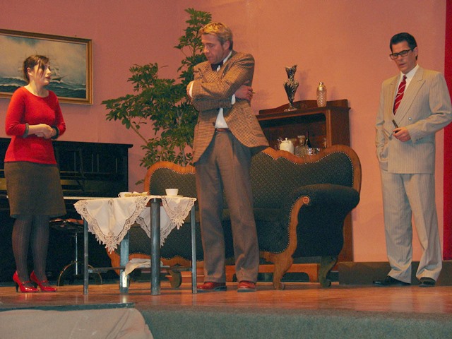 Helmuth Konnerth spielt den schwerhörigen, trunksüchtigen alten Bühnenhasen Selsdon, der als Einbrecher entweder zu früh oder zu spät kommt. Rüdiger Clasani ist der eitle Regisseur Lloyd, Annette Hauptführer die Regie-Assistentin Poppy, die alles abbekommt, und Hans Kaiser ist als Inspizient Tim das „Mädchen für alles“. Verstanden? Nein? Macht nichts.