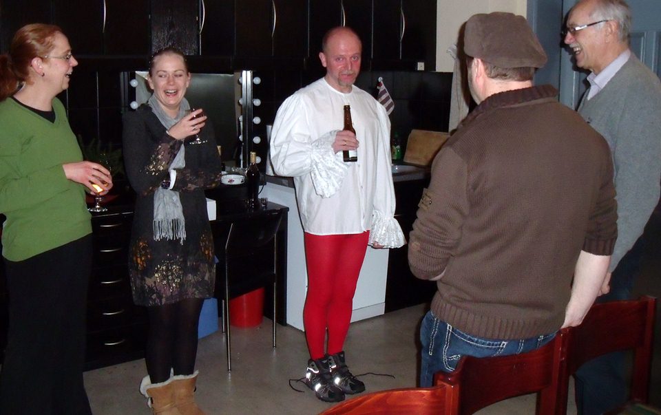 assermusik von Georg Friedrich Händel geben sich die Ehre: (von links) Müller Ortho (gespielt von Uwe Fischbach), die Frau des Wirts Herbord (Bärbel Kahle), Stadtschreiber Gregorius (Hans Kaiser), Stiftsfräulein Lutgard von Leimbach (Celine Weisenfeld), eine namenlose Bürgerin (Tanja Friebertshäuser), Landgraf Hermann (Benny Schmidt), Stiftsfräulein Gertrud von Leimbach (Jana Drescher) und Ritter Tammo von Beltershausen (Patrick Konnerth).